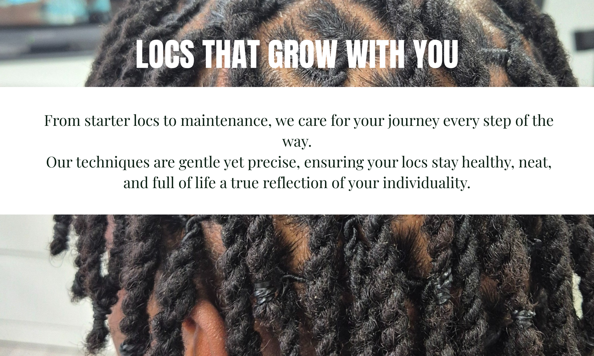Our goal is to keep your locs healthy, strong, and a true reflection of your individuality. Consistent care and proper maintenance every 4–8 weeks help prevent breakage and promote healthy growth.